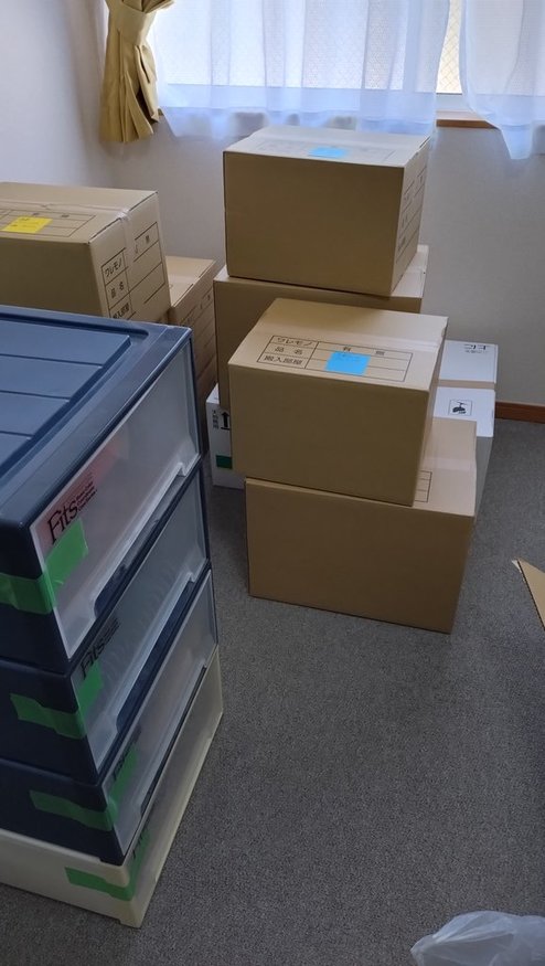 ちょっと遅れて引っ越し屋さんが来て荷物をうけとることになりました。しかし、いざ荷受けしてみると荷物が多さにちょっとびっくり。自宅では箱を分散しておいていたの感じませんでしたが、一カ所に集まると「ほんとうに入るの?」と思うくらいの量でした。